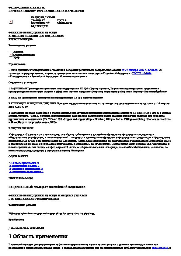 Наша цель состоит в том, чтобы предоставить вам быстрый доступ к содержанию документа Фитинги-переходники из меди и медных сплавов для соединения трубопроводов. Технические условия.