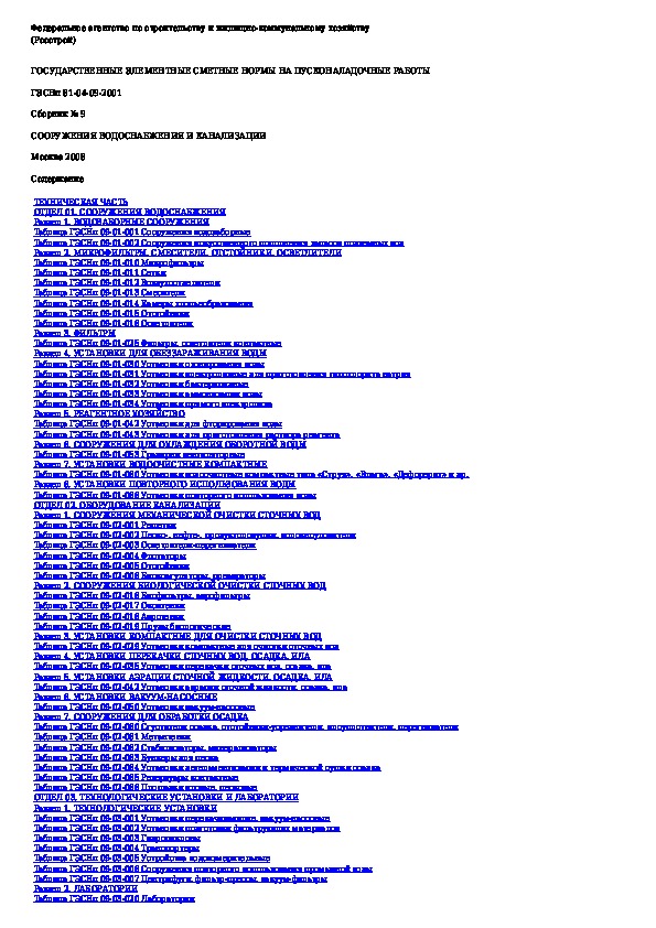 Наша цель состоит в том, чтобы предоставить вам быстрый доступ к содержанию документа Государственные элементные сметные нормы на пусконаладочные работы. Сборник 9. Сооружения водоснабжения и канализации (издание 2008.