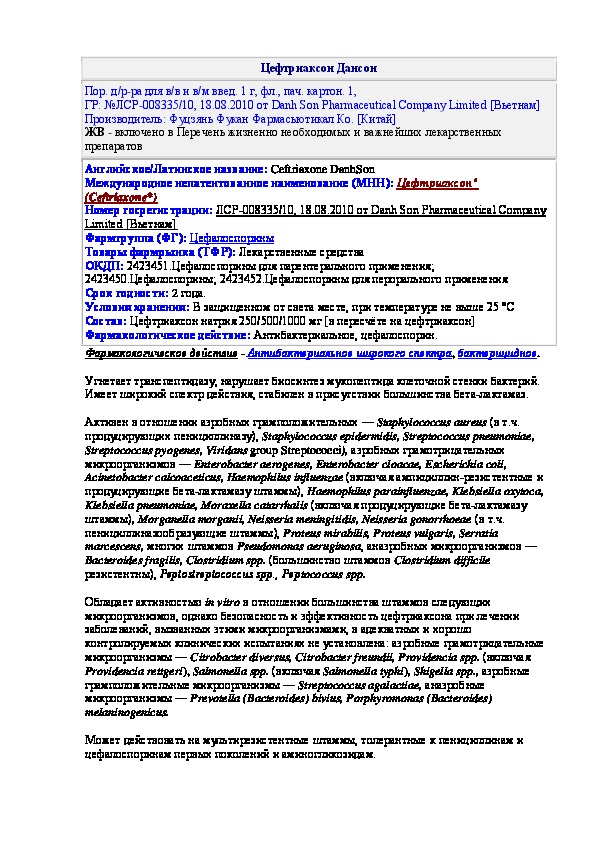 Перед Вами Инструкция по применению лекарственного препарата Цефтриаксон Дансон. Вы можете ознакомиться и скачать данную