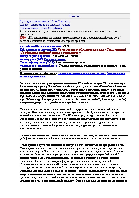 Перед Вами Инструкция по применению лекарственного препарата Циплин. Вы можете ознакомиться и скачать данную