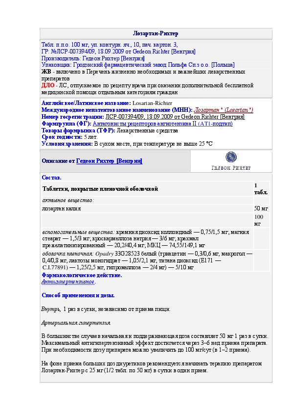 • Загрузка на компьютер - Вы можете также скачать Инструкция по применению лекарственного препарата Лозартан-Рихтер на свой компьютер и сохранить его в файлах.