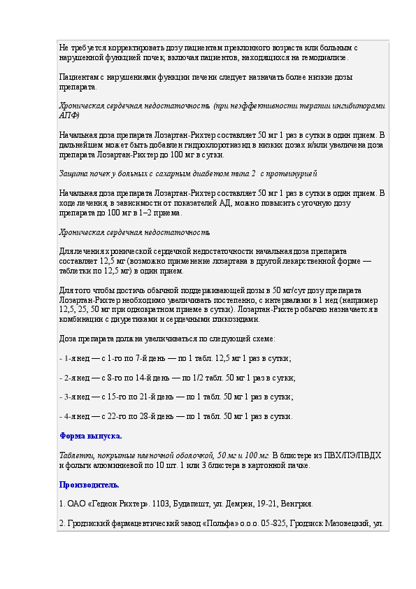 Нет необходимости печатать всю инструкцию по применению лекарственного препарата Лозартан-Рихтер, можно выбрать только нужные страницы инструкции по применению того или иного лекарственного препарата или таблеток.