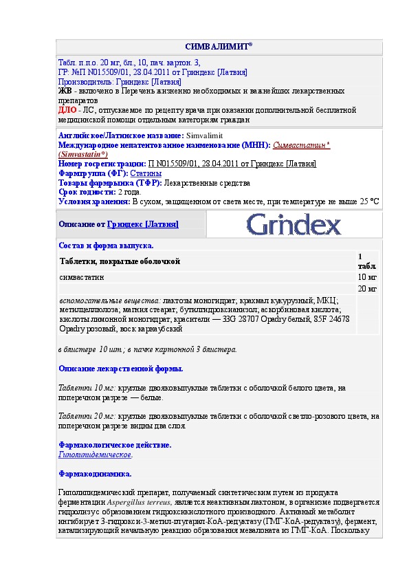 Инструкция по применению лекарственного препарата СИМВАЛИМИТ