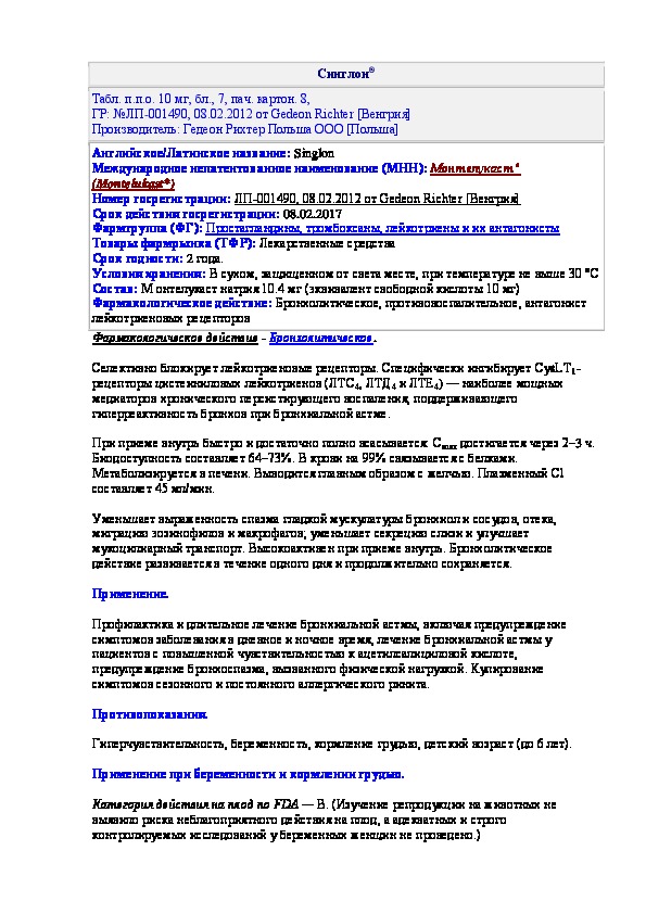 • Загрузка на компьютер - Вы можете также скачать Инструкция по применению лекарственного препарата Синглон на свой компьютер и сохранить его в файлах.