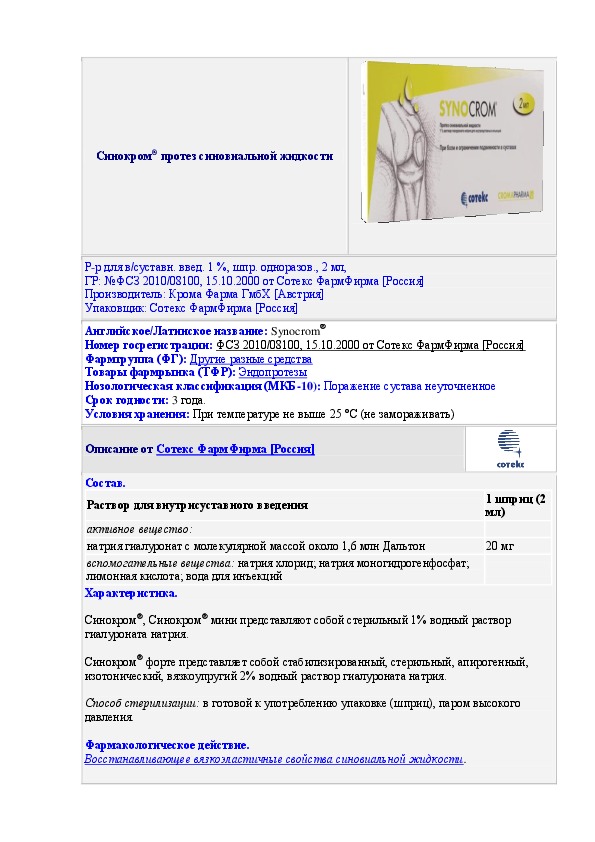 Инструкция по применению лекарственного препарата Синокром протез синовиальной жидкости