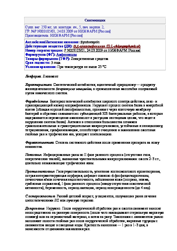 Перед Вами Инструкция по применению лекарственного препарата Синтомицин. Вы можете ознакомиться и скачать данную
