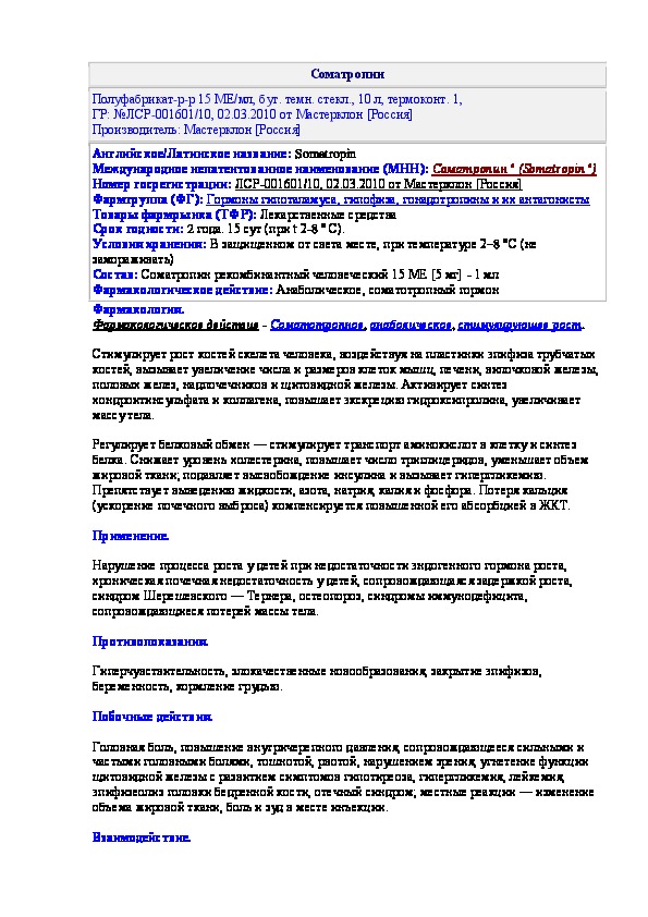 Наша цель состоит в том, чтобы предоставить вам быстрый доступ к содержанию инструкции по применению лекарственного препарата Соматропин.