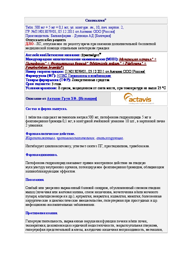 Смотрите также другие инструкции из раздела Спазмалгон