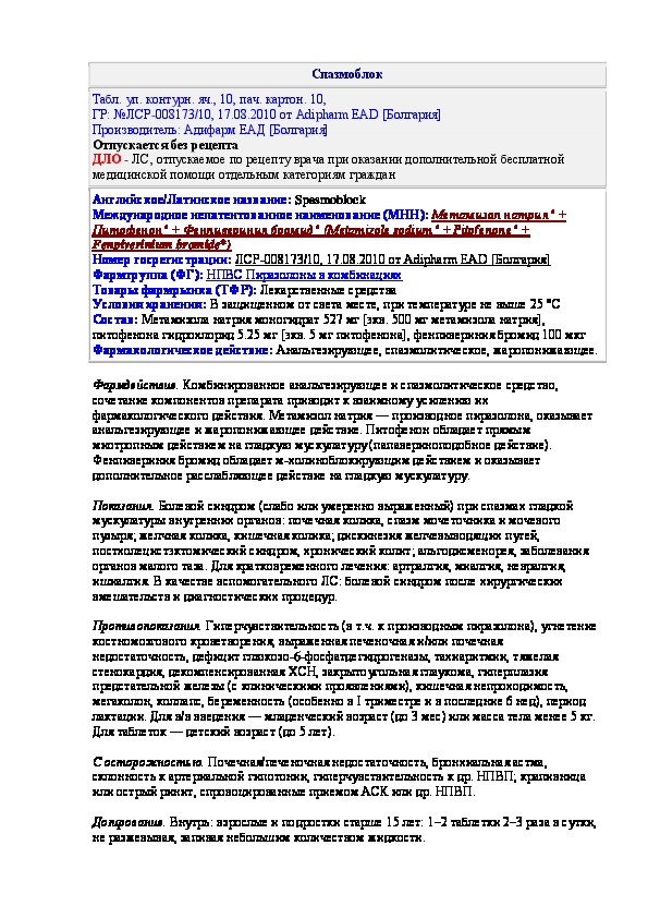 Нет необходимости печатать всю инструкцию по применению лекарственного препарата Спазмоблок, можно выбрать только нужные страницы инструкции по применению того или иного лекарственного препарата или таблеток.