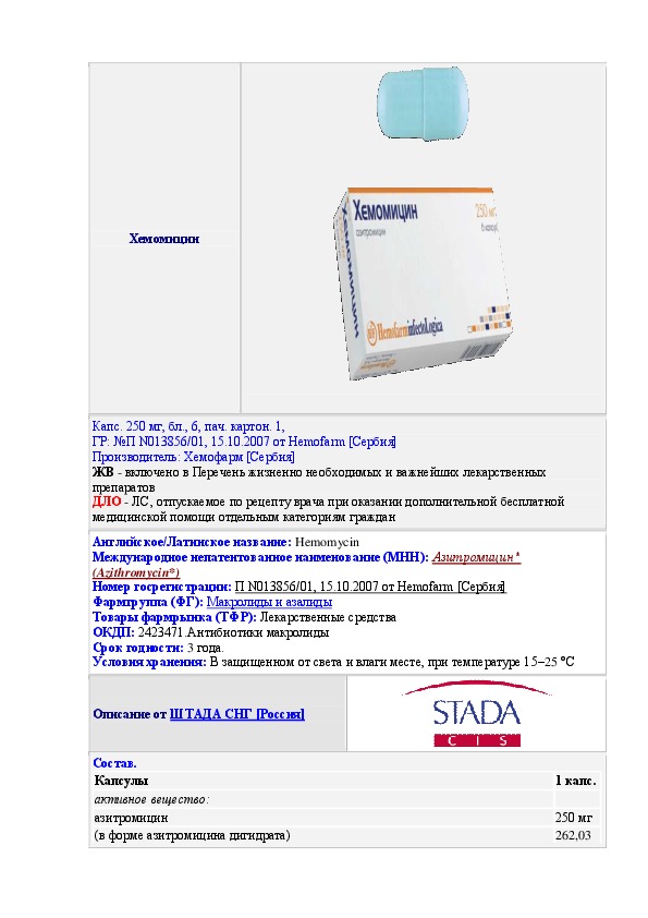 Перед Вами Инструкция по применению лекарственного препарата Хемомицин. Вы можете ознакомиться и скачать данную инструкцию по применению бесплатно. В инструкции таблеток и лекарственных препаратов описан способ и особенности применения, а также противопоказания и аналог препарата. Инструкция производителя на русском языке позволяет правильно принимать таблетки и другие лекарства.