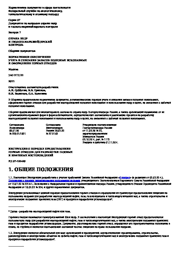 РД 07-122-96: Инструкция о порядке предоставления горных отводов для разработки газовых и нефтяных месторождений