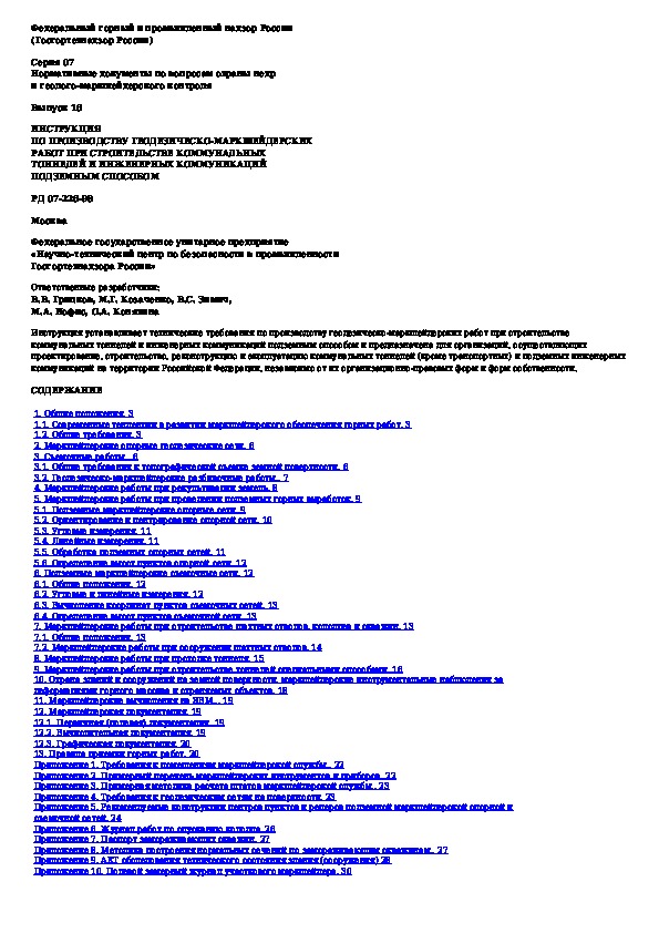 Наша цель состоит в том, чтобы предоставить вам быстрый доступ к содержанию документа Инструкция по производству геодезическо-маркшейдерских работ при строительстве коммунальных тоннелей и инженерных коммуникаций.