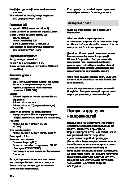 Многие люди предпочитают читать документы не на экране, а в печатной версии. Возможность печати руководства пользователя также была предусмотрена на нашем сайте, и вы можете использовать ее, нажав на иконку «печать» в Pdf-viewer. Нет необходимости печатать все руководство автомагнитолы Sony CDX-G1000U(UE), можно выбрать только нужные страницы инструкции.