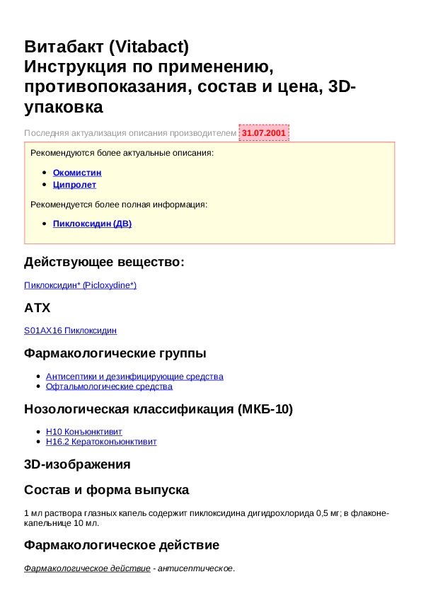 С помощью онлайн просмотра, Вы можете быстро просмотреть содержимое инструкции для препарата Витабакт .