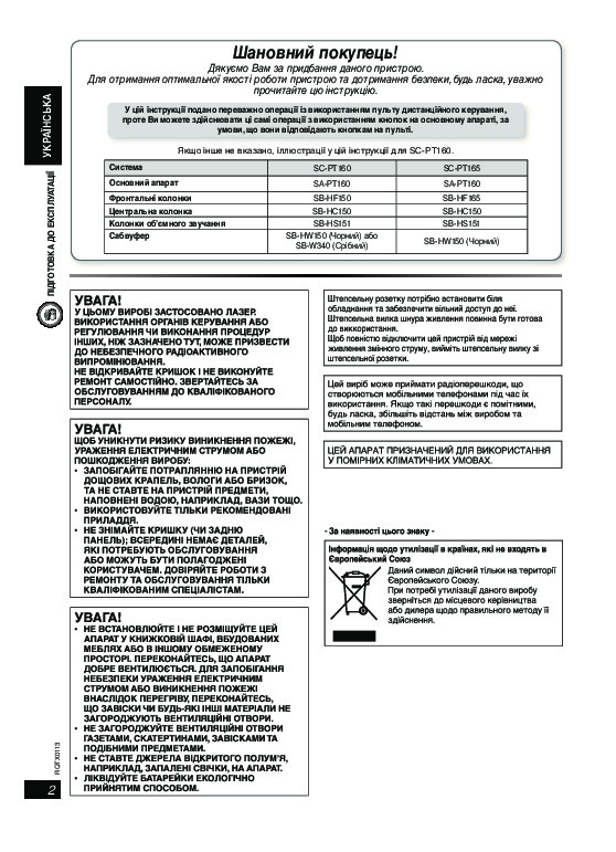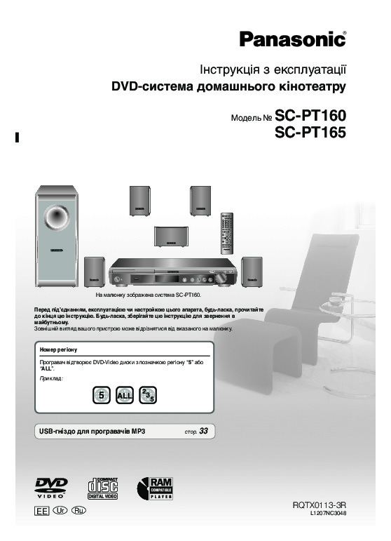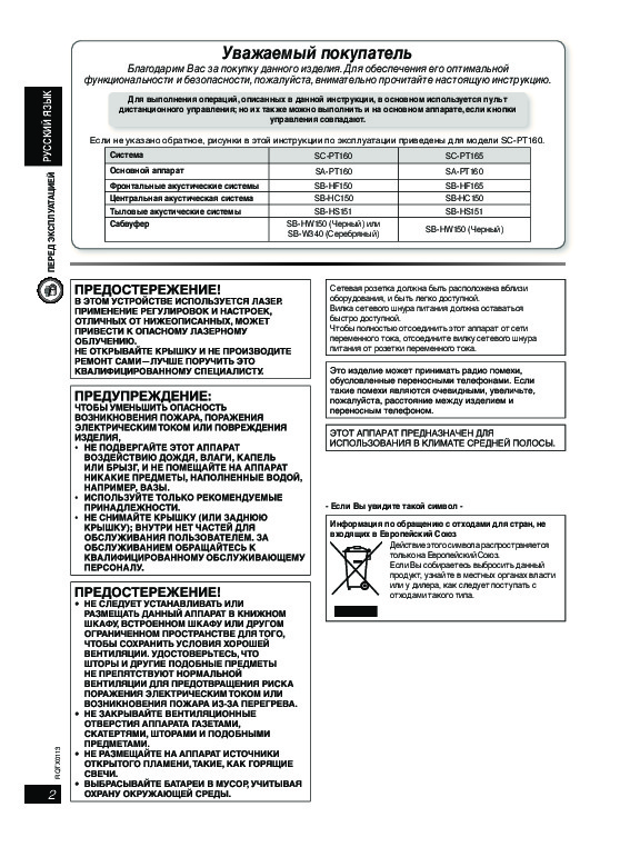 Перед Вами Инструкция домашнего кинотеатра Panasonic SC-PT160. Вы можете ознакомиться и скачать данное руководство по эксплуатации бесплатно.