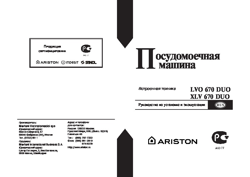 Наша цель состоит в том, чтобы предоставить вам быстрый доступ к содержанию инструкции для посудомоечной машины Ariston XLV 670 DUO.