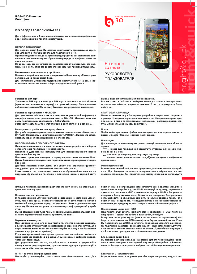 Перед Вами Инструкция сотового gsm, смартфона BQ BQS-4510 Florence. Вы можете ознакомиться и скачать данное руководство по эксплуатации бесплатно.