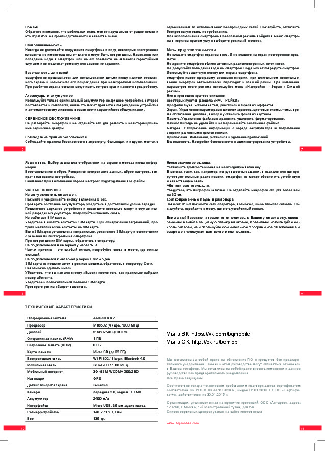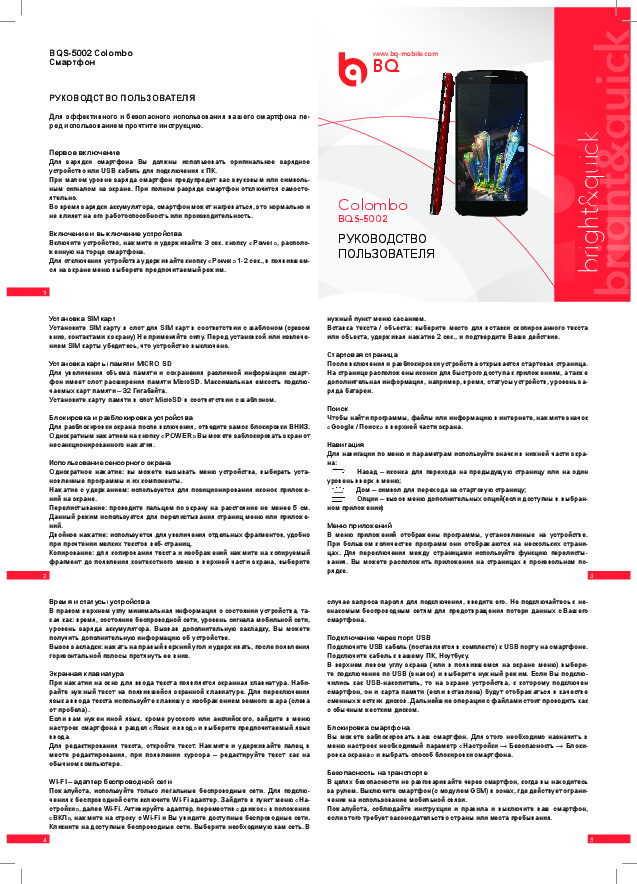 Если листать руководство пользователя сотового gsm, смартфона BQ BQS-5002 COLOMBO прямо на сайте, не очень удобно для Вас, есть два возможных решения: