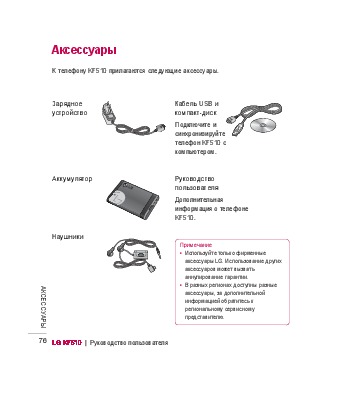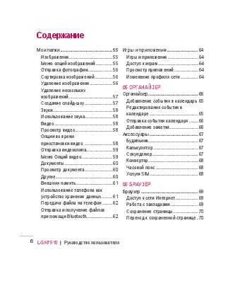 С помощью онлайн просмотра, Вы можете быстро просмотреть содержимое инструкции и найти решение проблемы с сотового gsm, смартфона LG KF510.
