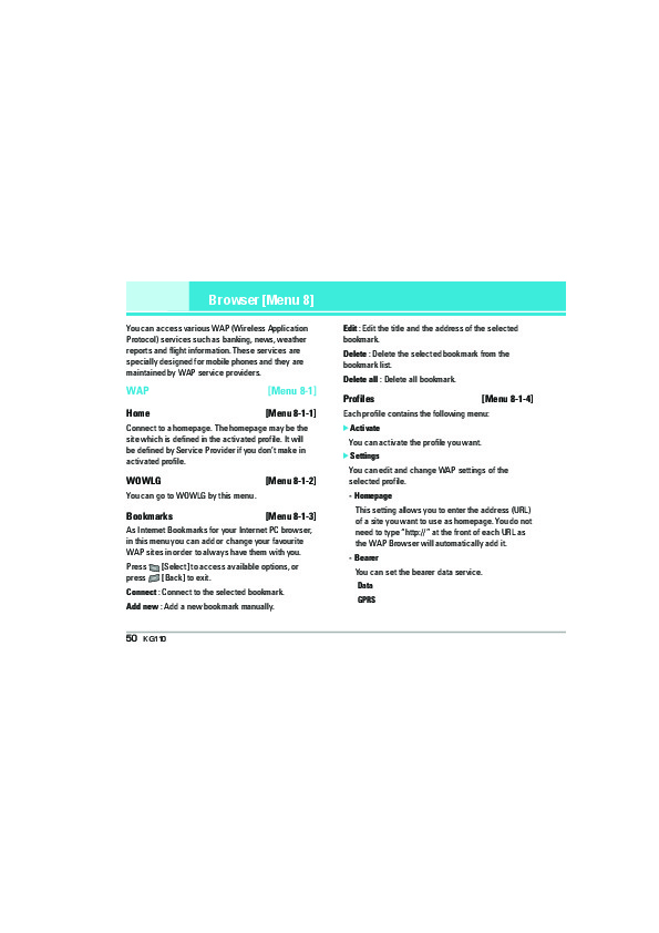 Наша цель состоит в том, чтобы предоставить вам быстрый доступ к содержанию инструкции для сотового gsm, смартфона LG KG110. С помощью онлайн просмотра, Вы можете быстро просмотреть содержимое инструкции и найти решение проблемы с сотового gsm, смартфона LG KG110.