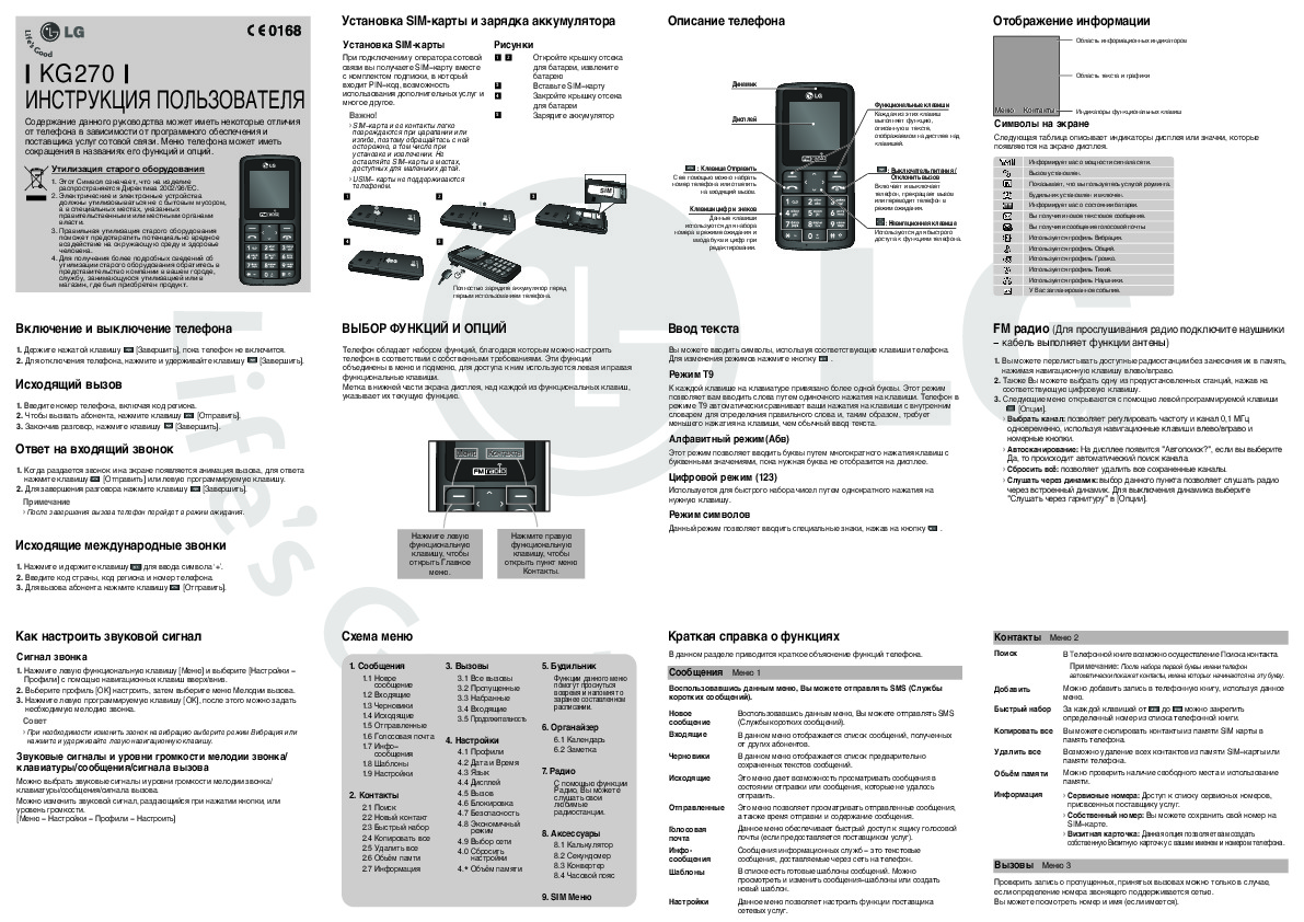 Перед Вами Инструкция сотового gsm, смартфона LG KG270. Вы можете ознакомиться и скачать данное руководство по эксплуатации бесплатно.