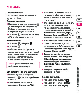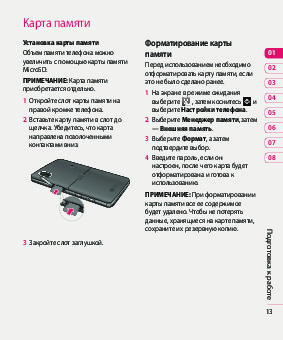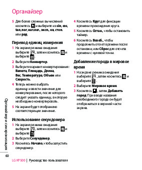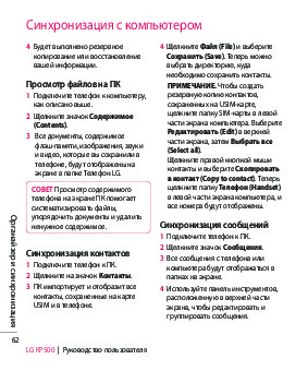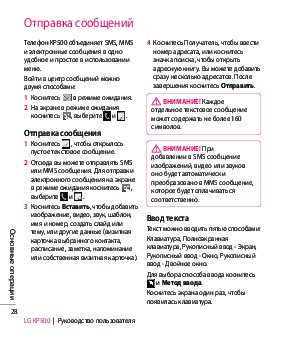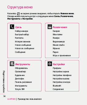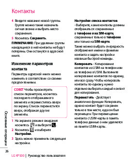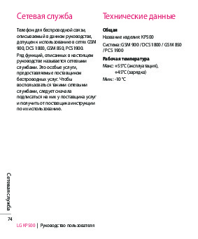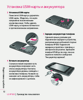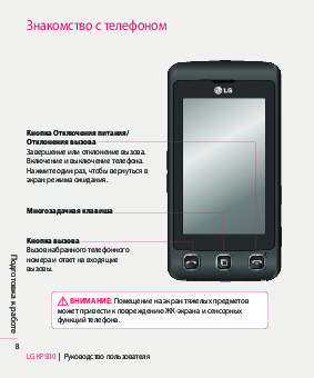 С помощью онлайн просмотра, Вы можете быстро просмотреть содержимое инструкции и найти решение проблемы с сотового gsm, смартфона LG KP500.