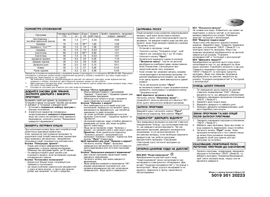 Многие люди предпочитают читать документы не на экране, а в печатной версии. Возможность печати руководства пользователя также была предусмотрена на нашем сайте, и вы можете использовать ее, нажав на иконку «печать» в Pdf-viewer. Нет необходимости печатать все руководство стиральной машины Whirlpool AWG 7013_AWG 7043(Таблица программ), можно выбрать только нужные страницы инструкции.