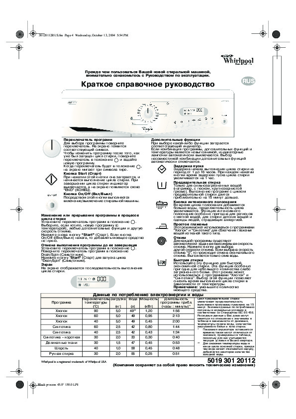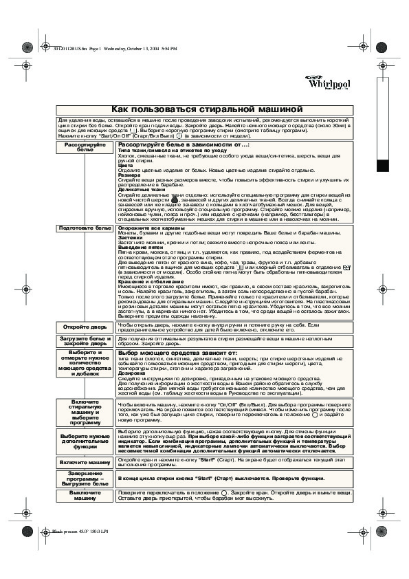 Перед Вами Инструкция стиральной машины Whirlpool AWG 876(Краткое руководство). Вы можете ознакомиться и скачать данное руководство по эксплуатации бесплатно. Инструкция по применению на русском языке, предложенная производителем, позволяет правильно использовать Вашу бытовую технику и электронику.