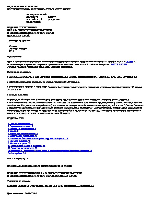 ГОСТ Р 54300-2011: Изделия огнеупорные для кладки воздухонагревателей и воздухопроводов горячего дутья доменных печей. Технические условия