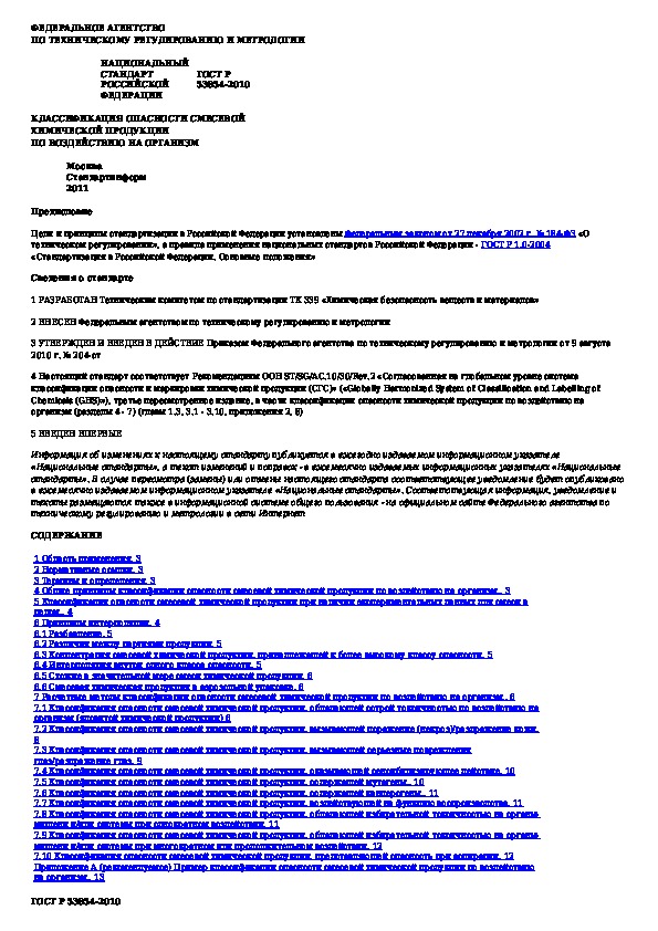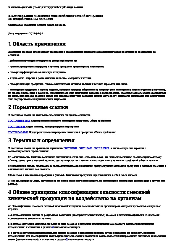ГОСТ Р 53854-2010: Классификация опасности смесевой химической продукции по воздействию на организм