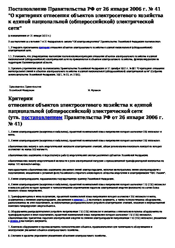 Критерии отнесения объектов электросетевого хозяйства к единой национальной (общероссийской) электрической сети