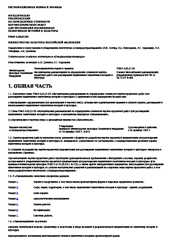 РНиП 4.05.01-93: Методические рекомендации по определению стоимости научно-проектных работ для реставрации недвижимых памятников истории и культ