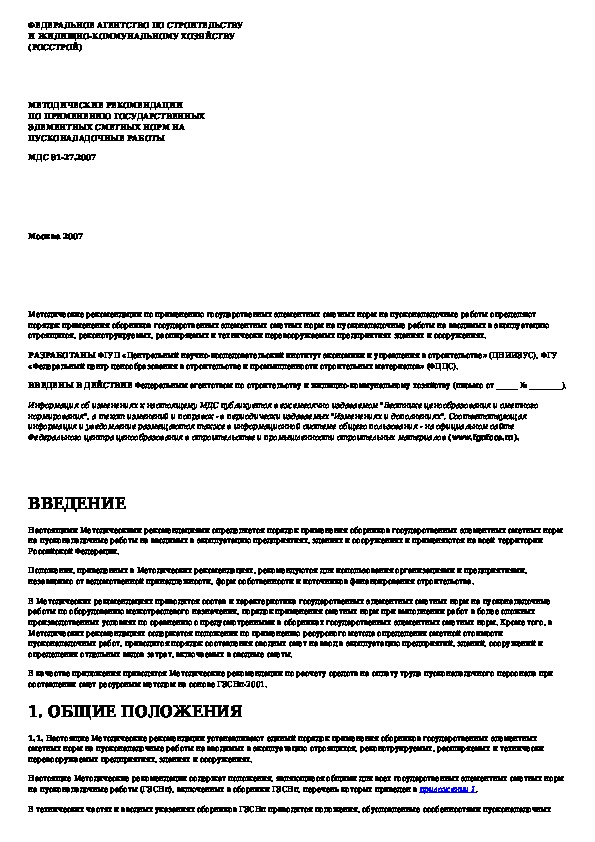 МДС 81-27.2007: Методические рекомендации по применению государственных элементных сметных норм на пусконаладочные работы