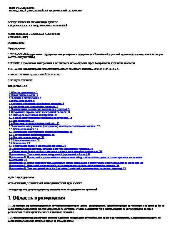 ОДМ 218.3.003-2010: Методические рекомендации по содержанию автодорожных тоннелей