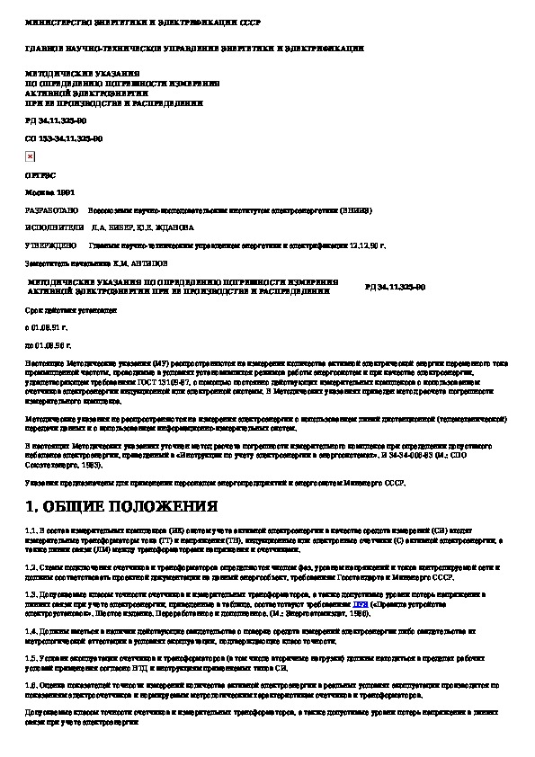 СО 153-34.11.325-90: Методические указания по определению погрешности измерения активной электроэнергии при ее производстве и распределении