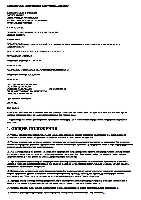 Методические указания по разработке норм расхода материалов на ремонтно-эксплуатационные нужды в энергетике