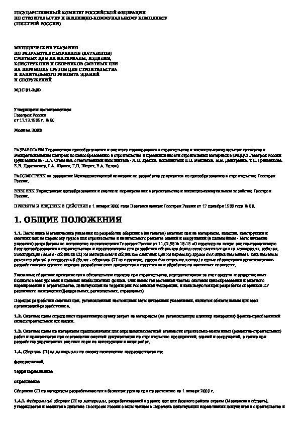 МДС 81-2.99: Методические указания по разработке сборников (каталогов) сметных цен на материалы, изделия, конструкции и сборников сметных цен н