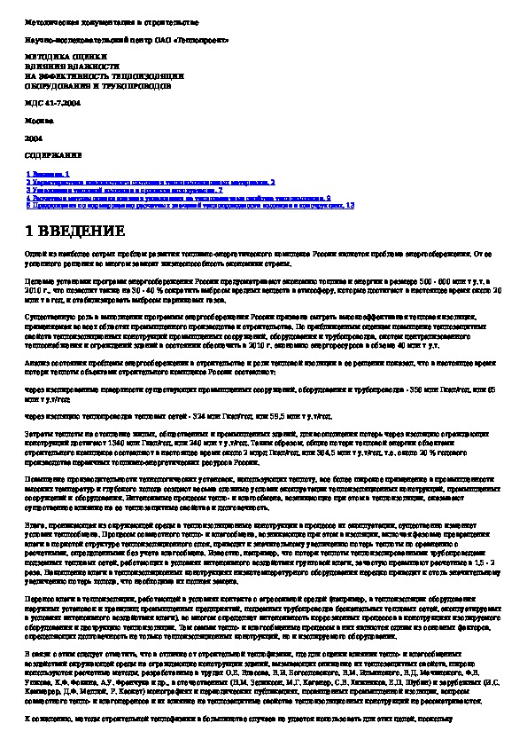 МДС 41-7.2004: Методика оценки влияния влажности на эффективность теплоизоляции оборудования и трубопроводов