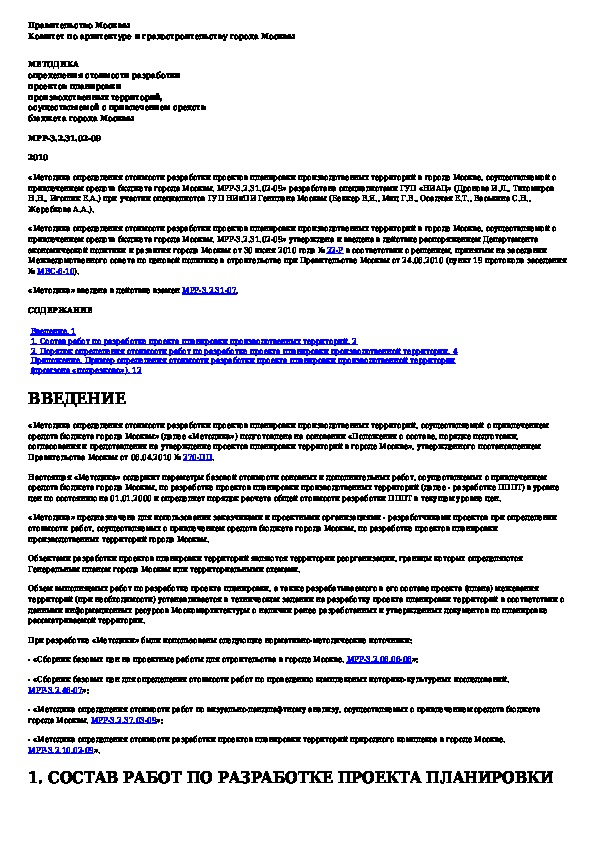 МРР 3.2.31.02-09: Методика определения стоимости разработки проектов планировки производственных территорий, осуществляемой с привлечением средс