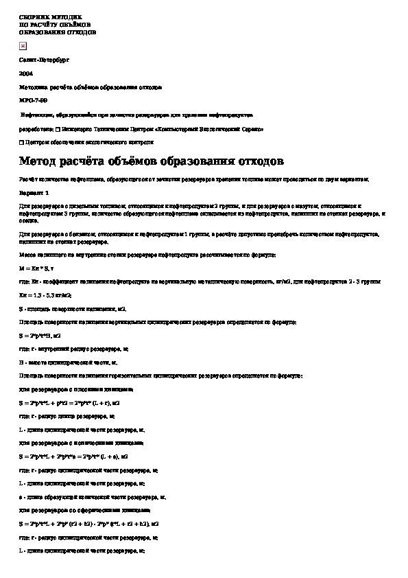 • Просмотр в полноэкранном режиме - легко просмотреть документ Методика расчета объемов образования отходов. Нефтешлам, образующийся при зачистке резервуаров для хранения нефтепродуктов (без загрузки его на свой компьютер).