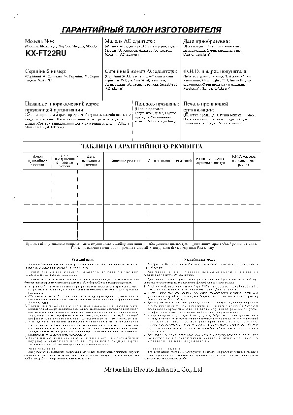 Перед Вами Инструкция - KX-FT22RU. Вы можете ознакомиться и скачать данное руководство по эксплуатации бесплатно. Инструкция по применению на русском языке, предложенная производителем, позволяет правильно использовать Вашу бытовую технику и электронику.