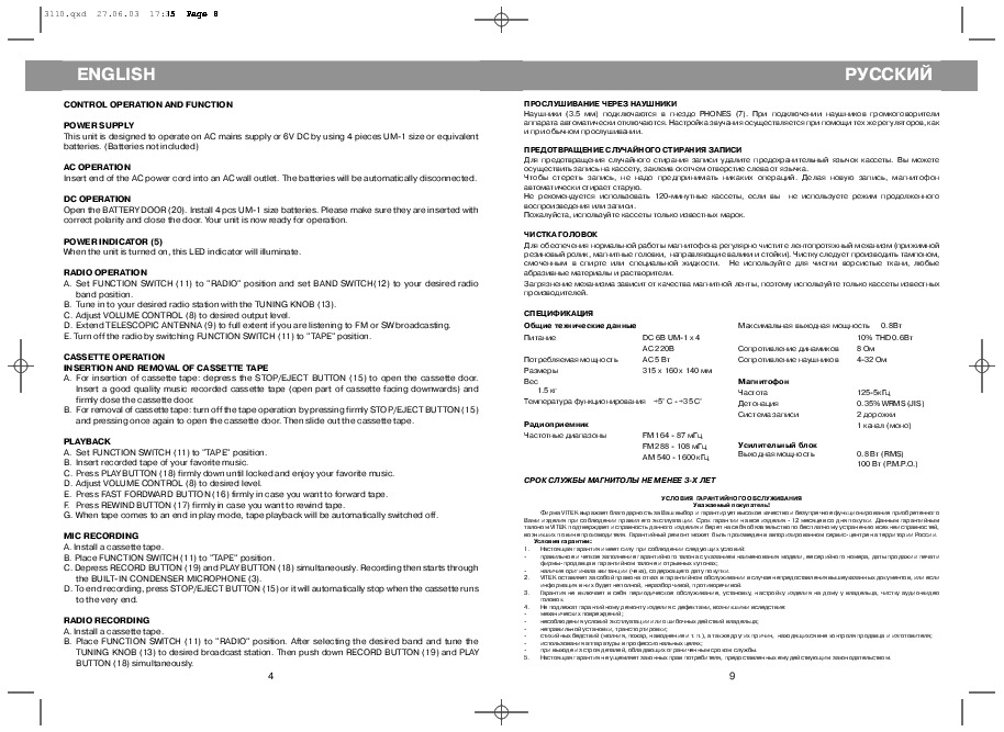 Перед Вами Инструкция - VT-3110. Вы можете ознакомиться и скачать данное руководство по эксплуатации бесплатно. Инструкция по применению на русском языке, предложенная производителем, позволяет правильно использовать Вашу бытовую технику и электронику.