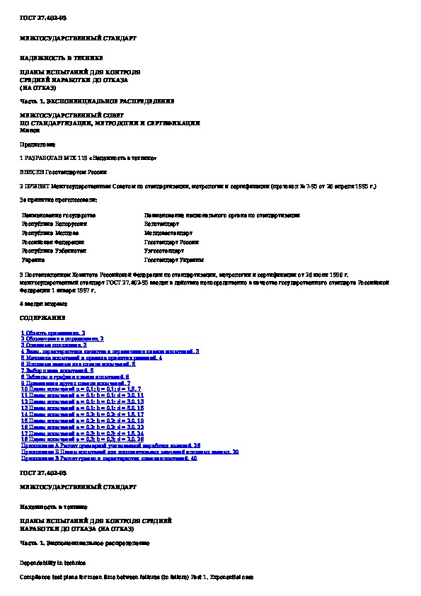 ГОСТ 27.402-95: Надежность в технике. Планы испытаний для контроля средней наработки до отказа (на отказ). Часть 1. Экспоненциальное распределение