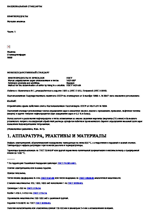 ГОСТ 1431-85: Нефтепродукты и присадки. Метод определения серы сплавлением в тигле