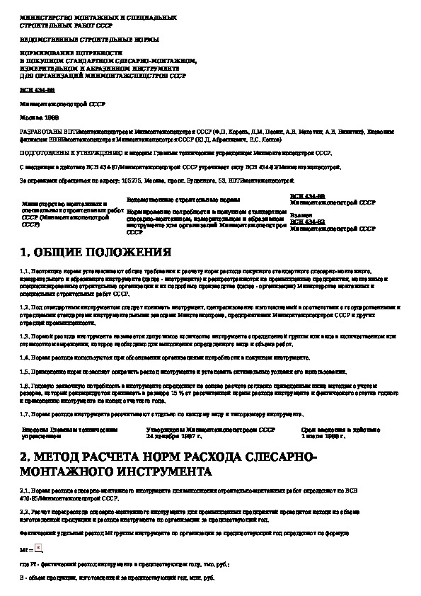 ВСН 434-88: Нормирование потребности в покупном стандартном слесарно-монтажном, измерительном и абразивном инструменте для организаций Минм