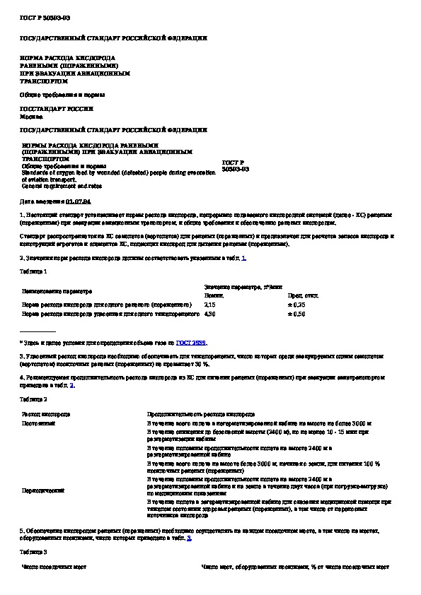 ГОСТ Р 50593-93: Нормы расхода кислорода ранеными (пораженными) при эвакуации авиационным транспортом. Общие требования и нормы
