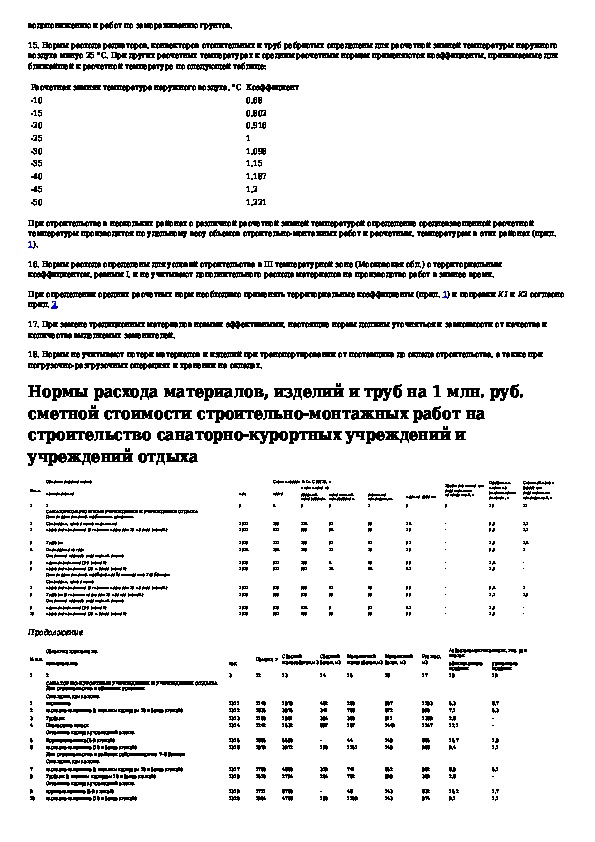 Нормы расхода материалов изделий и труб на 1 млн. руб. сметной стоимости строительно-монтажных работ на строительство санаторно-ку