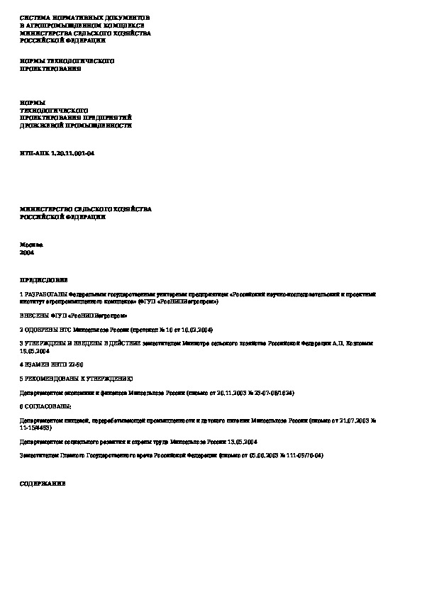 НТП АПК 1.20.11.001-04: Нормы технологического проектирования предприятий дрожжевой промышленности