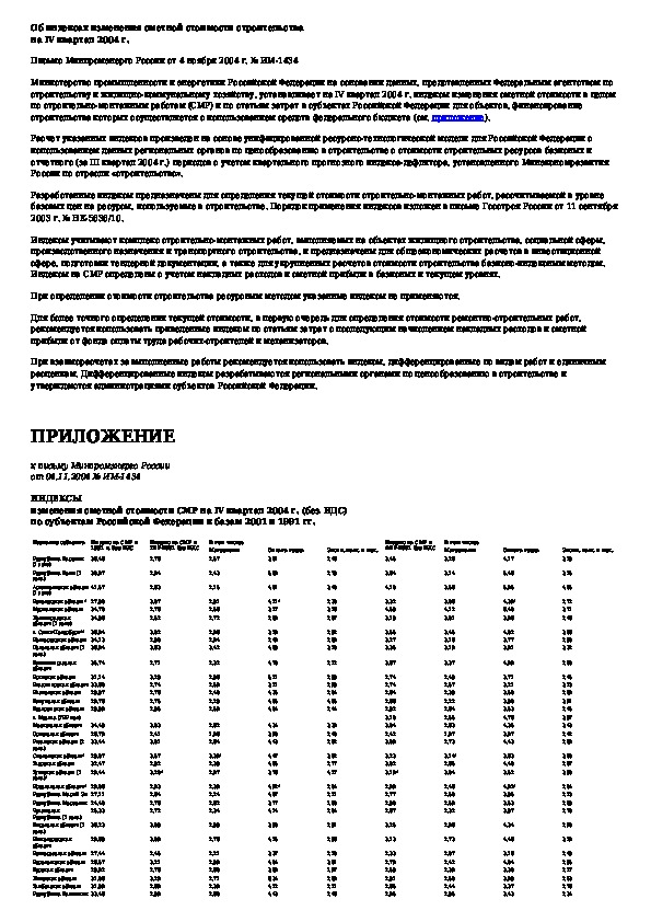 Об индексах изменения сметной стоимости строительства на IV квартал 2004 г.