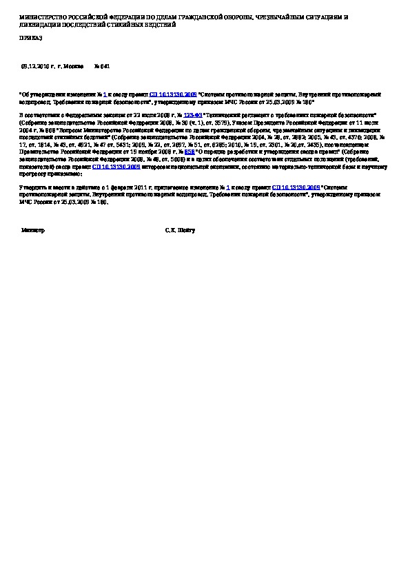 Приказ 641: Об утверждении изменения № 1 к своду правил СП 10.13130.2009 "Системы противопожарной защиты. Внутренний противопожарный водопровод. Тре